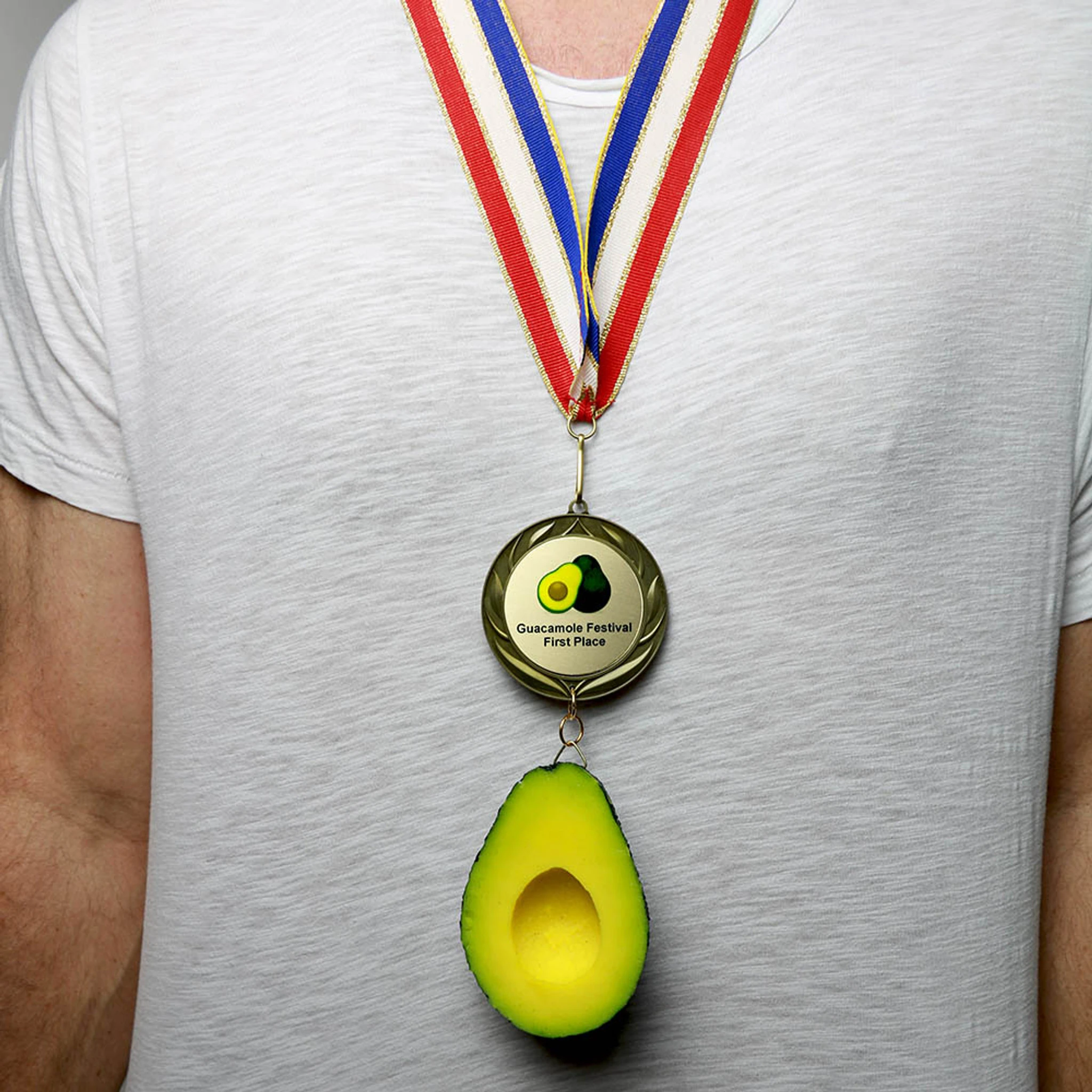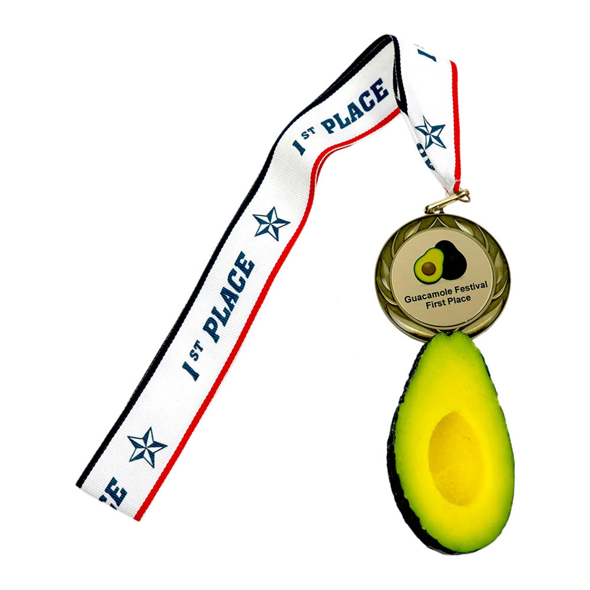 The Avocado Medal is the top prize for guacamole lovers. This versatile fruit medal, makes a great runner up award when given with our Avocado Trophy. Avocado measures 5..5″ x 2.5″ x 1.5″. Hangs on a 1.5″ wide ribbing that is 15″ long. Many ribbon styles available. Personalize the Avocado Medal with an engraved Antique Gold Wreath Medal for an additional $10.Â
