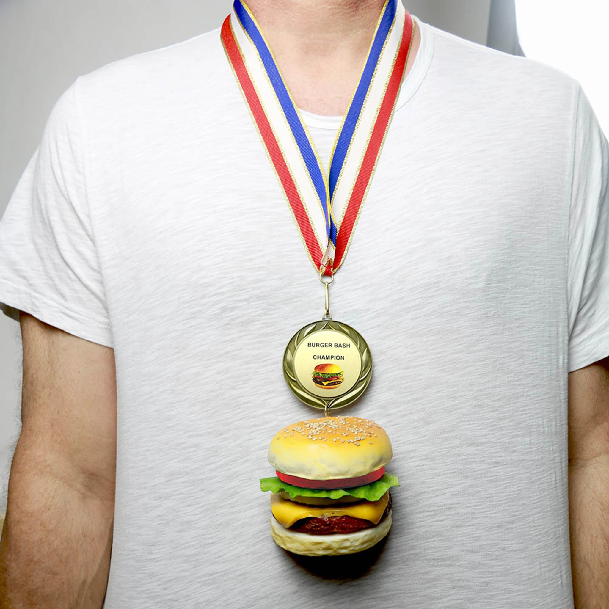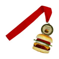 The Cheeseburger Medal looks great around the neck of the best burger griller. Also perfect for cheeseburger lovers. Makes a great runner up prize when awarded with our Far Out Burger Award or any of our burger trophies.Ā Burger measures 4″ long and 2″ tall. Hangs on a 1.5″ wide ribbing that is 15″ long. Many ribbon styles available. Personalize the Cheeseburger Medal with anĀ engraved Antique Gold Wreath Medal for an additional $10.Ā