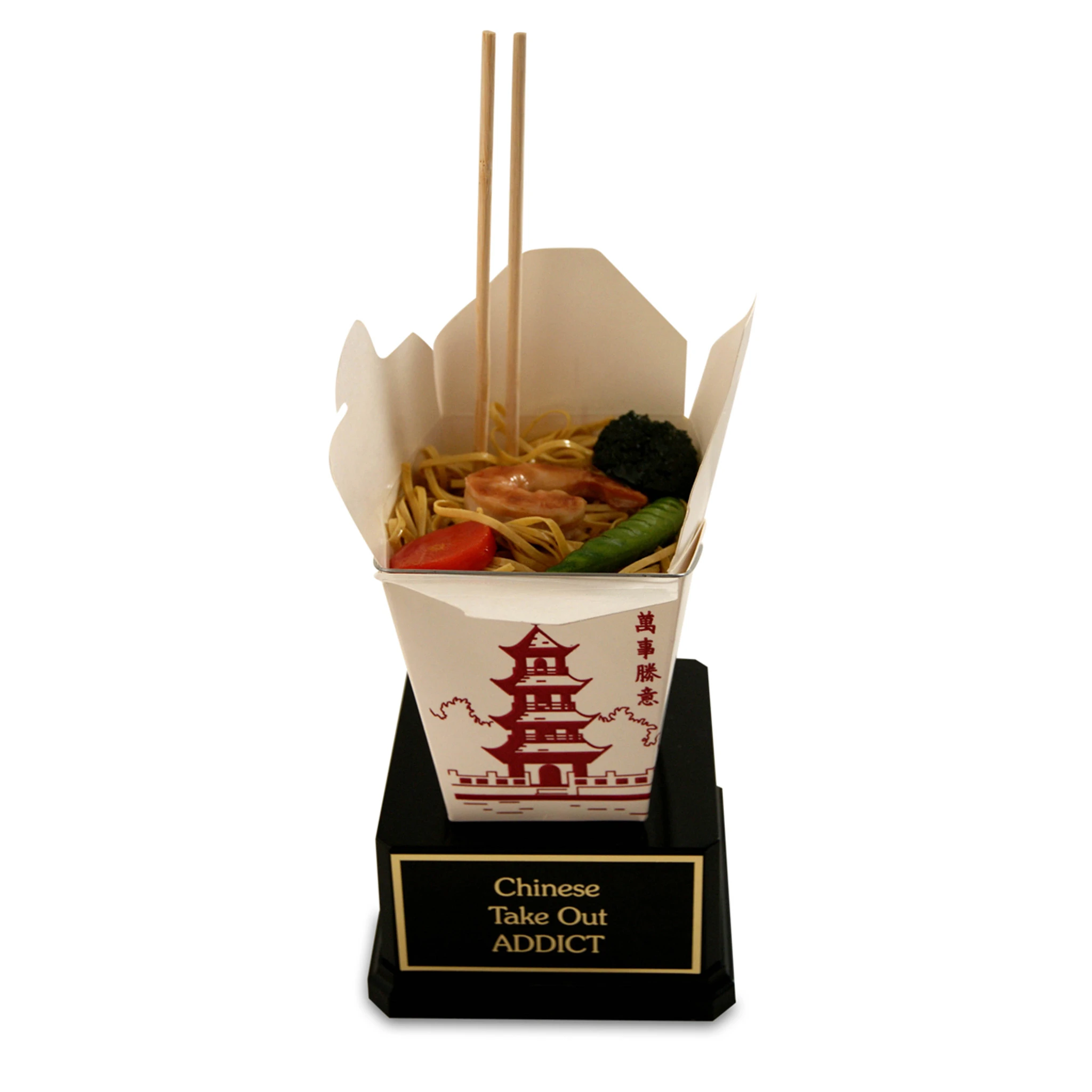 This Chinese Take Out Trophy is perfect if you are you addicted to Chinese food. Or maybe you go to the best Chinese restaurant in town and want to honor their great food. This Chinese take out trophy has a box noodles with a shrimp, carrot, broccoli, and a snow pea, with a pair of chop sticks sticking out. We also have several other Chinese food awards like the Egg Roll Trophy and the Golden Dumpling Award Gyoza Shumai Trophy.