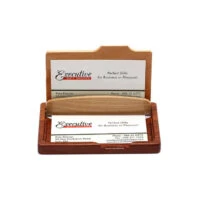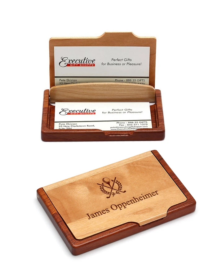 For the client, co-worker or boss, family member, or friend who loves the game of golf, here’s a professional gift that is sure to be used at work and on the 19th hole! It’s a two-tone wood business card holder that doubles as a pocket and a desktop card holder. It holds up to 8 business cards and is laser-engraved on the cover with our Crossing Golf Clubs emblem. Add free custom personalization to make a hole-in-one with your gift! The business card holder comes packaged in a gift-ready box.