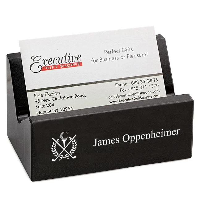 Combine your love for your profession with your love for the game of golf with this solid black marble business card holder! The rack holds up to 25 business cards on a desktop or counter and is slanted for the best display of your information. The front is laser-engraved with a Crossing Golf Clubs emblem on the left side, leaving room for custom personalization on the right, available for free with your purchase. The card holder comes packaged in a gift box.