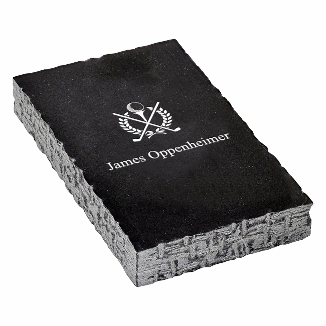 This solid black marble rectangular paperweight is both a practical desktop accessory and a conversation piece! The polished top surface features our laser-engraved Crossing Golf Clubs emblem that lets clients, associates, and the boss know that you’re a golfer to the core. Below the emblem, there’s space to add up to 6 lines of custom personalization, available for free with your purchase. The paperweight comes packaged in a gift box.