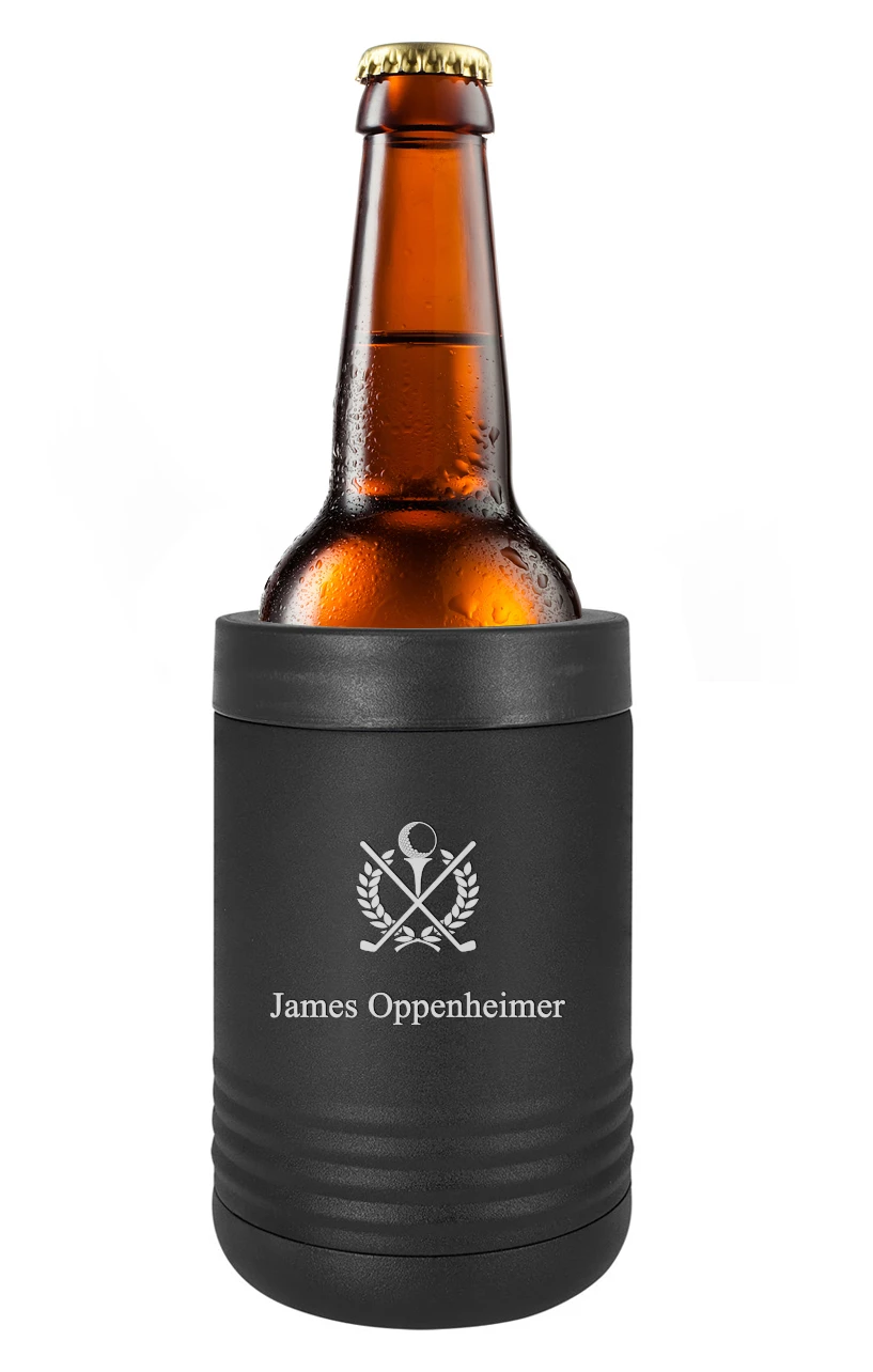 Keep your drink chilled to the perfect temperature on and off the golf course with this golf-themed beverage holder! The can holder is made of double-wall vacuum-insulated stainless steel, with a black-coated finish and a removable top with a rubber seal that locks a 12 oz. can or bottle securely in place! The front is laser-engraved with our Crossing Golf Clubs emblem with room for personalization below the emblem, available for free with your purchase. The beverage holder comes packaged in a gift box.
