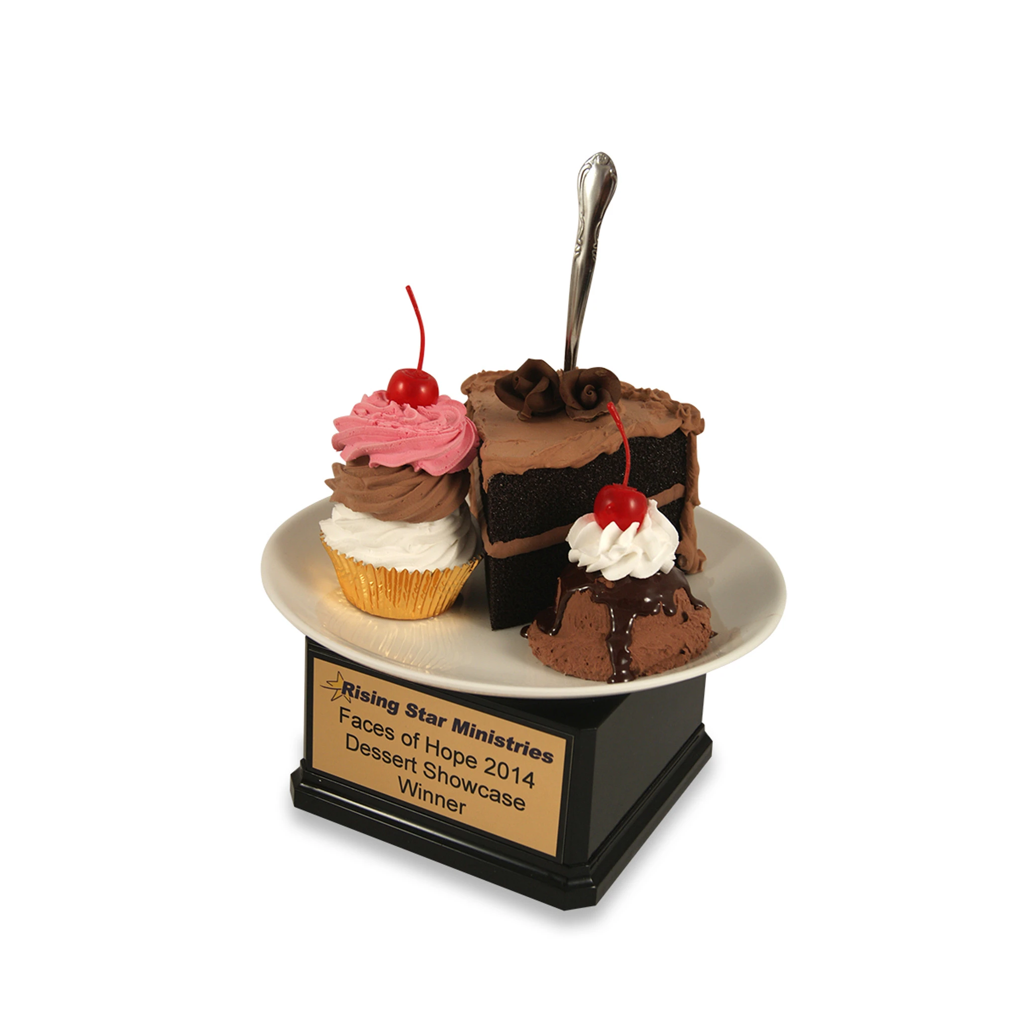 The Dessert Plate award is a great trophy for bake-off, overall dessert competition, even a bake-a-thon fundraiser. Under our dessert category, we have plenty of individual desserts from cupcakes, cakes, pies, ice cream, donuts, the possibilities are endless. But if you need a variety of desserts for an overall dessert competition, or just for a great baker or friend with a huge sweet tooth, the dessert plate award is a great unique option that incorporates a cupcake, slice of cake, and ice cream all into one award- with whipped cream and a cherry on top!