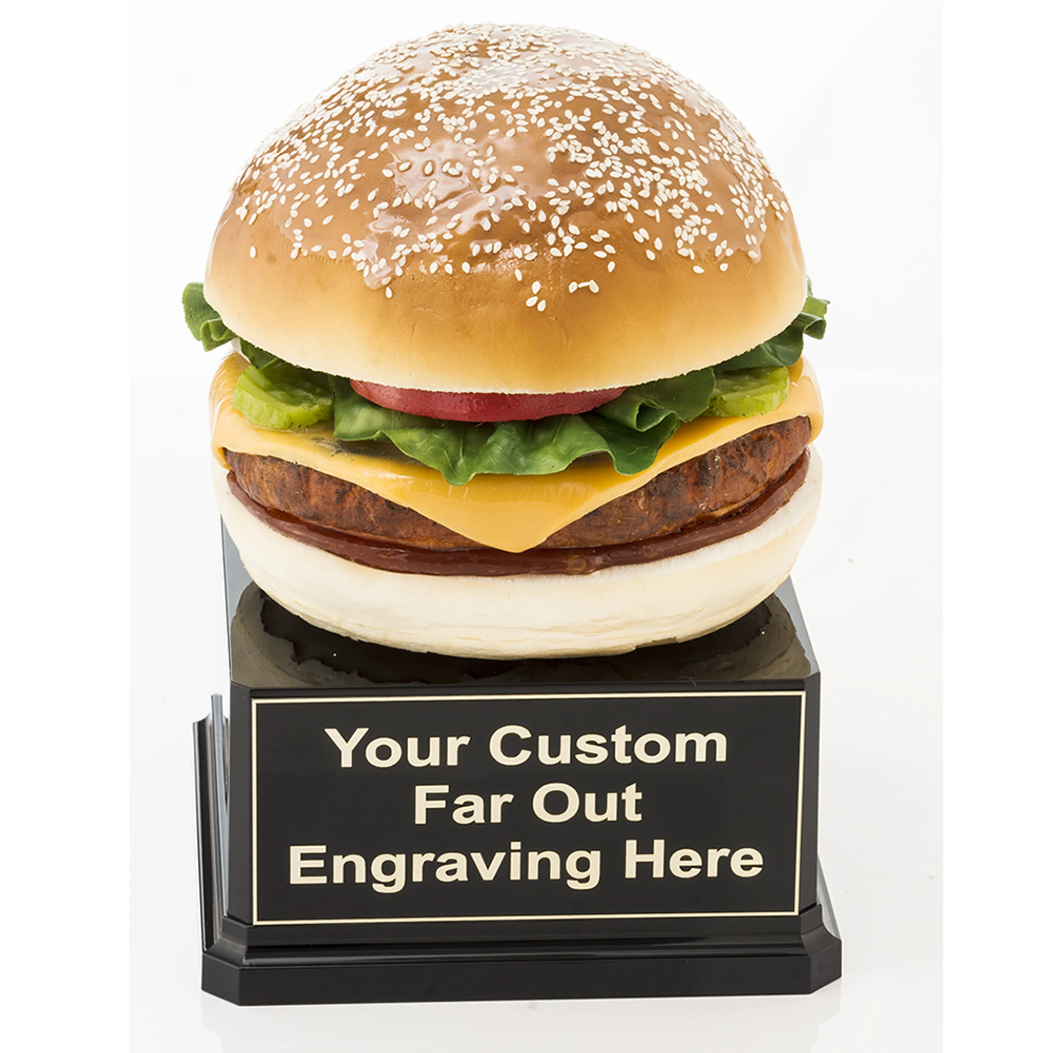 This Far Out Burger Trophy looks so real you’ll want to take a bite! This burger trophy is great for any burger realted occassion!! We carry all shapes and sizes of burger awards, like our Jumbo Hamburger Trophy and our Mini Slider Burger Trophy.