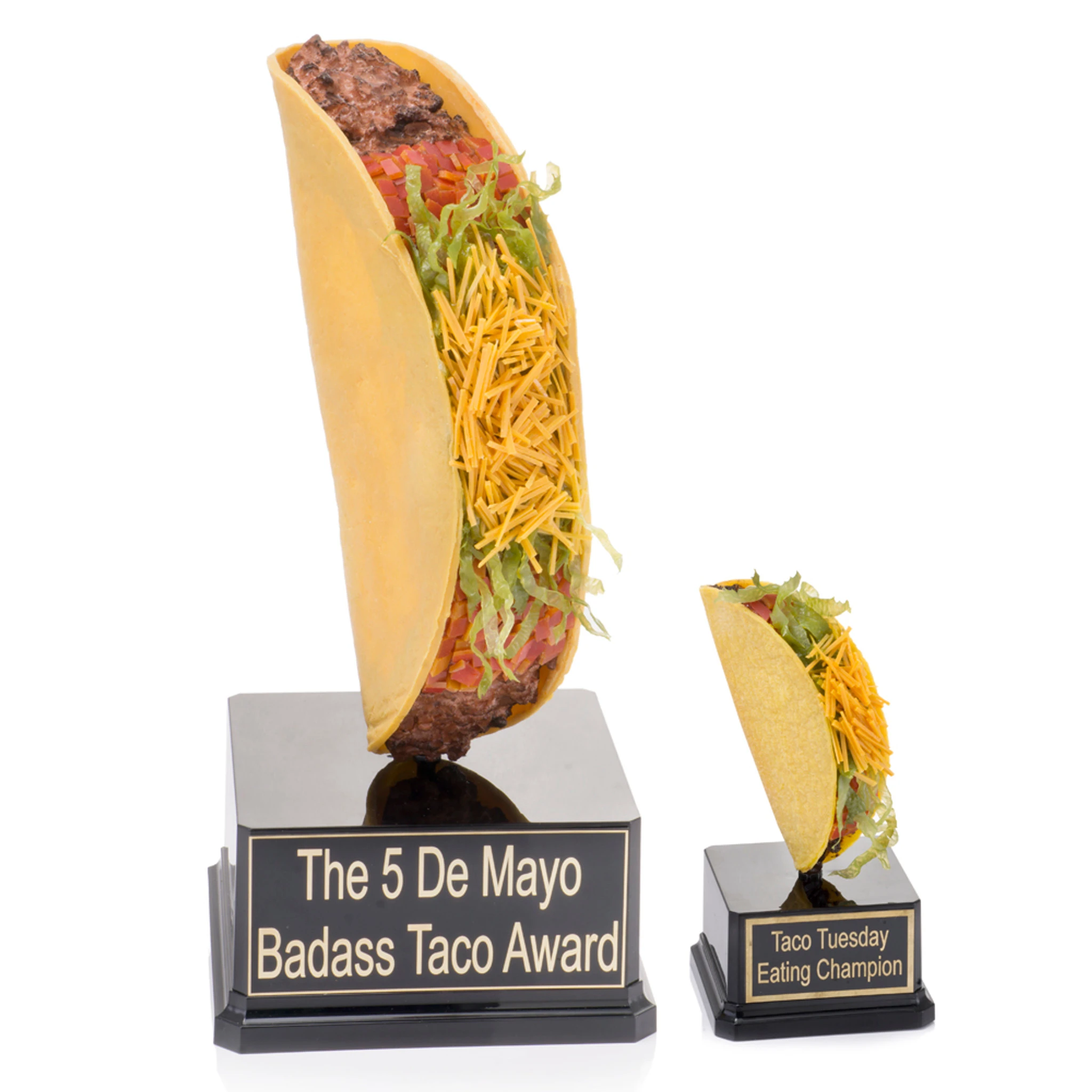 Taco lovers, feast your eyes on the Far Out Giant Taco Trophy. The completed award stands at ~ 14.75″ tall x 6.5″ wide, for a smaller more realistic sized taco, check out our original taco trophy.