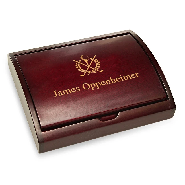 Designed for the professional business person who also loves the focus and finesse it takes to play the game of golf, this pen and pencil set is a classic gift that will be valued for years to come! The set features a ballpoint pen, rollerball pen and a mechanical pencil with lacquer finish and brass accents. They are stored in a curved espresso wood box that is laser-engraved with a Crossing Golf Clubs emblem. There’s room to personalize the box below the emblem with up to two lines of text, available for free with your purchase. The set comes packaged in a gift-ready box.