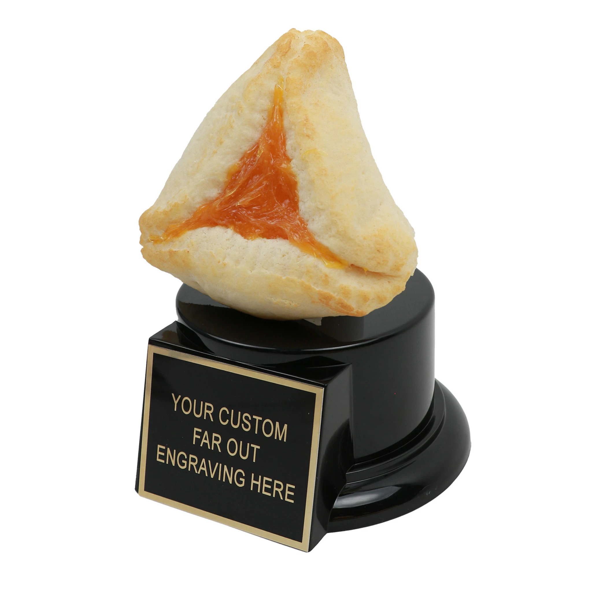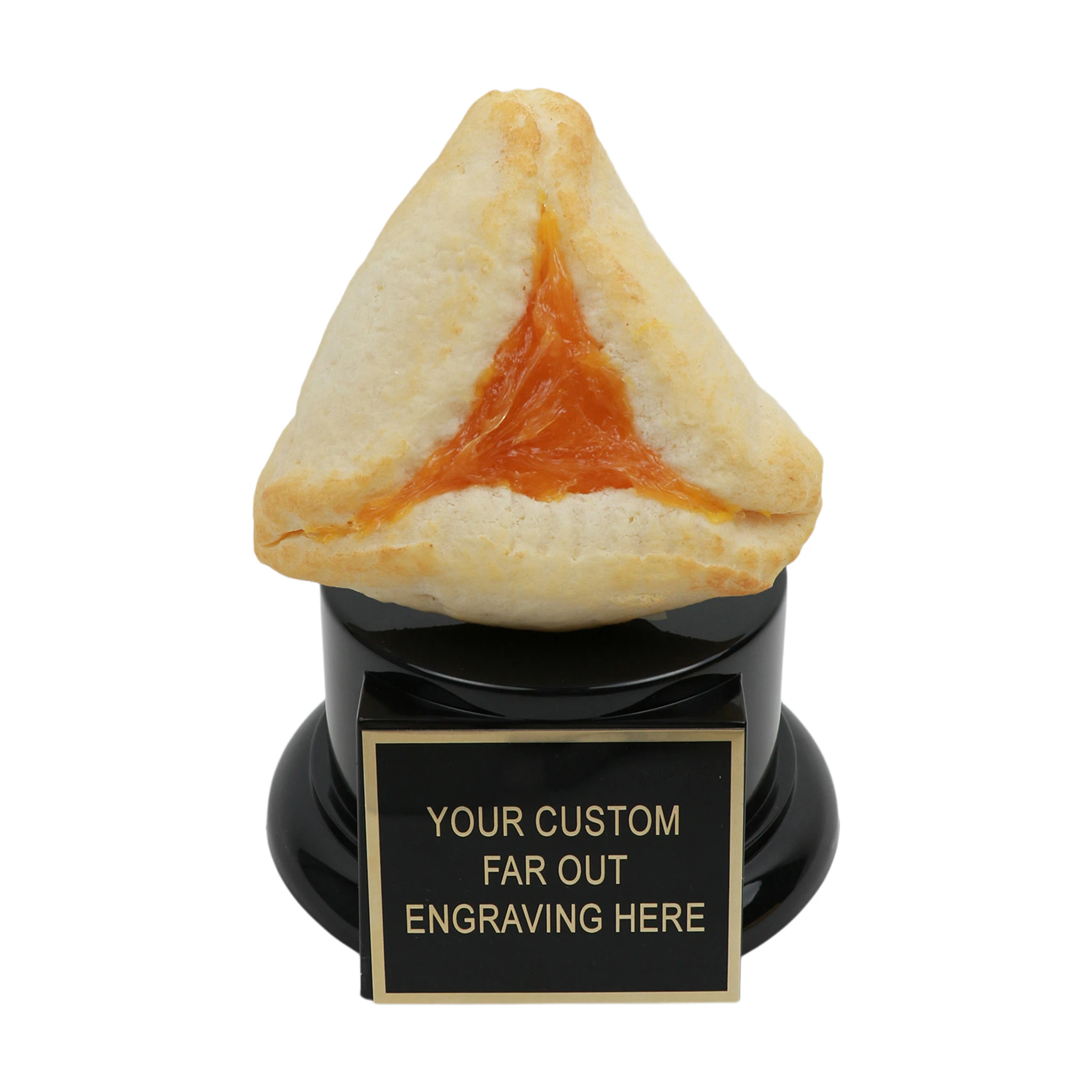 A realistic Hamantaschen Trophy. Stands 6.75″ tall with a square 5″ x 5″ base.