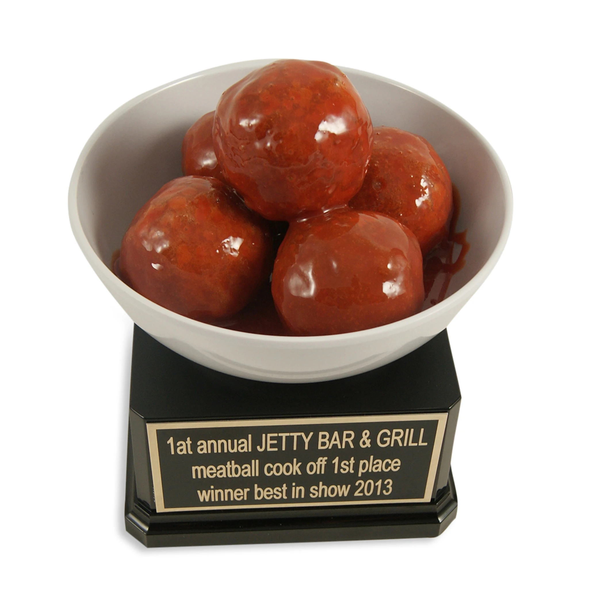 This Meatball Trophy is the perfect award for a meatball eating contest or best meatball making competition. Our meatballs look so real and so good, we hope they don’t show up the winner of the competition! This meatball trophy would pair nicely with our Spaghetti Trophy.