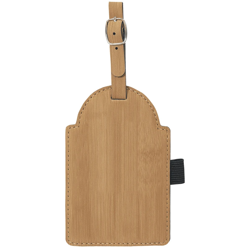 The bamboo finish on this leatherette tag adds a neutral, organic appearance to your golf bag! The tag features a buckle-closure attaching loop, top-stitching on all sides, and has 3 wood golf tees mounted on the front panel. Personalize with your name, initials or company name above the tees in black laser-engraved lettering, available at no extra cost with your purchase. The golf bag tag comes packaged in a handsome gift box.