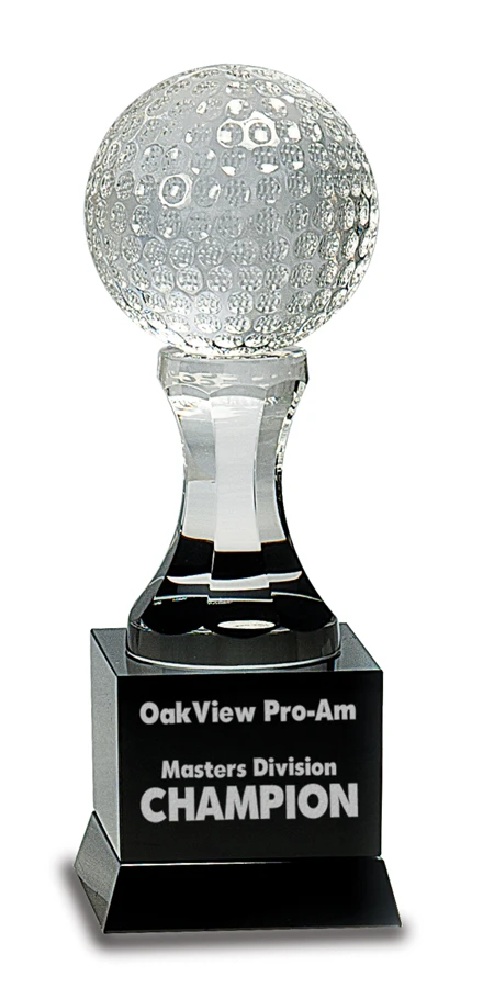 This solid crystal golf theme pedestal award is a high end gift, ideal for an employee recognition award or a grand prize in a golf tournament. It features an intricately detailed clear crystal golf ball perched on a faceted glass column. This column is mounted on a solid black crystal base. The base can be customized with text and/or your company logo free of charge. To add text engraving just check the Personalize It box above. You’ll be able to enter your desired wording, play with the font and size of each line and preview it before placing your order. If you’d like to add your company logo, check the Add Logo box above. You can attach an image, in black and white format, before adding the golf award to the shopping cart. For logo orders, we’ll email a proof before we proceed to production. This personalized crystal golf award comes packaged in a gift box and normally ships within one business day.