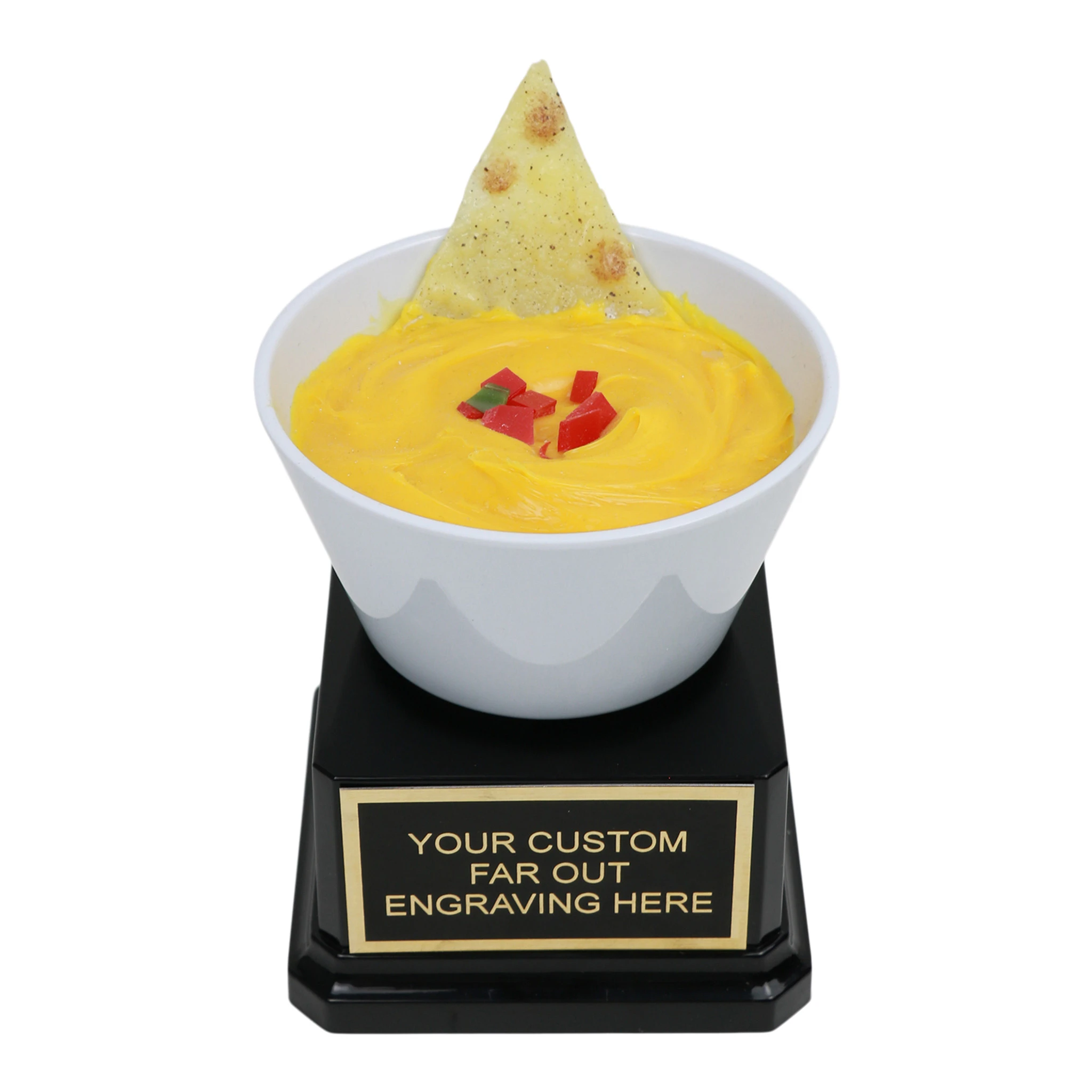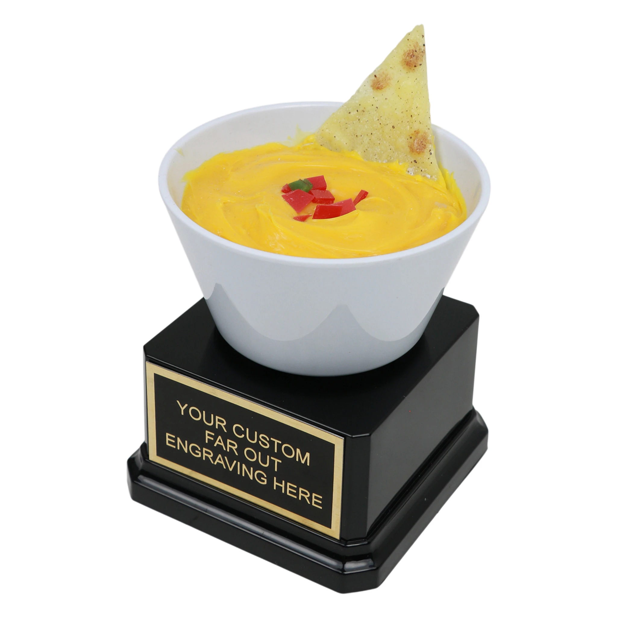 Queso Cheese Trophy is the perfect nacho cheese award for whoever made the best Mexican style dip. Trophy measures 3.5″ X 3.5″ and stands 5.5″ tall. Personalize with free engraving.