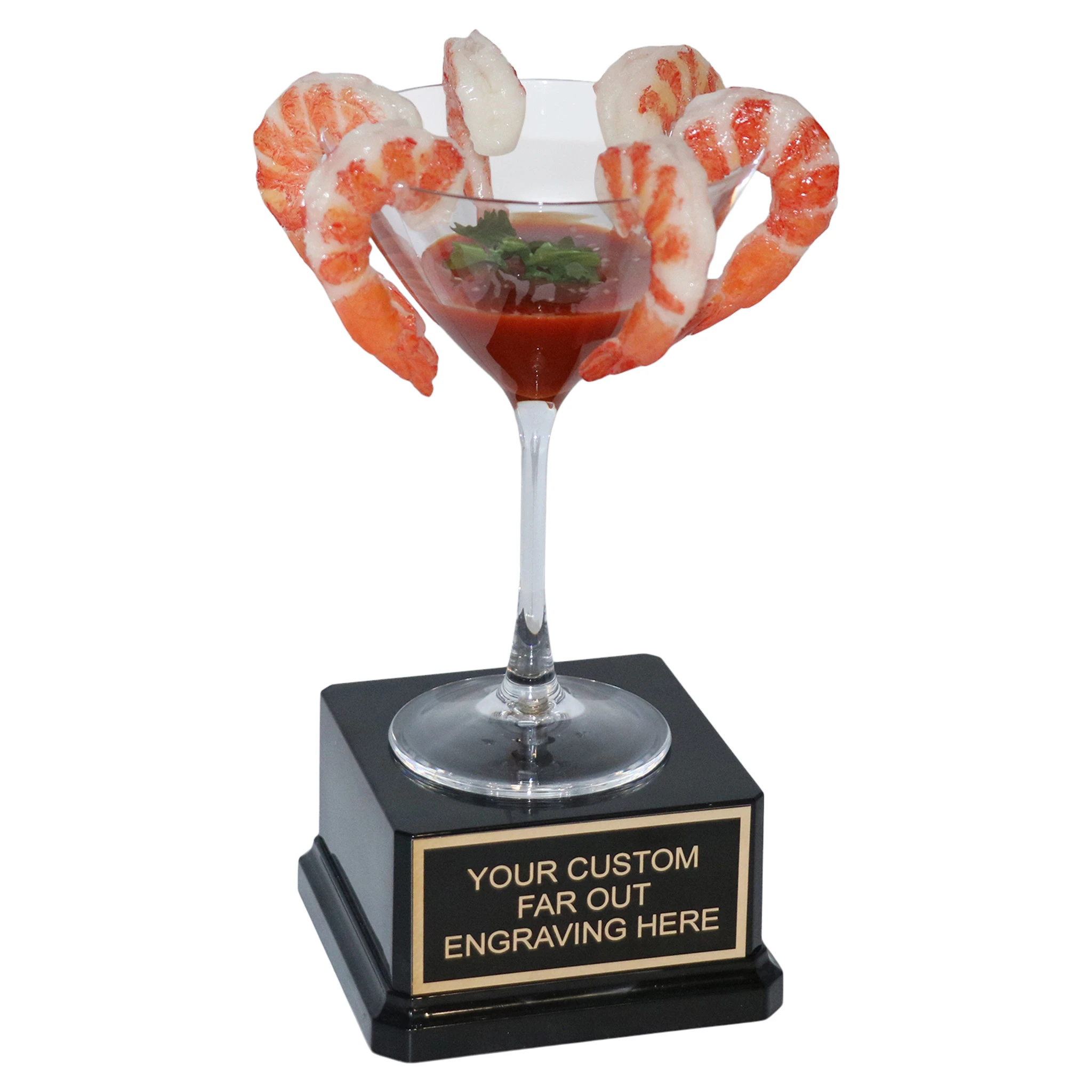 This classic Shrimp Cocktail Trophy is the perfect award for anyone loving shrimp. Placed in a martini glass with six shrimp with cocktail sauce and garnish. All trophies come with free custom engraving.