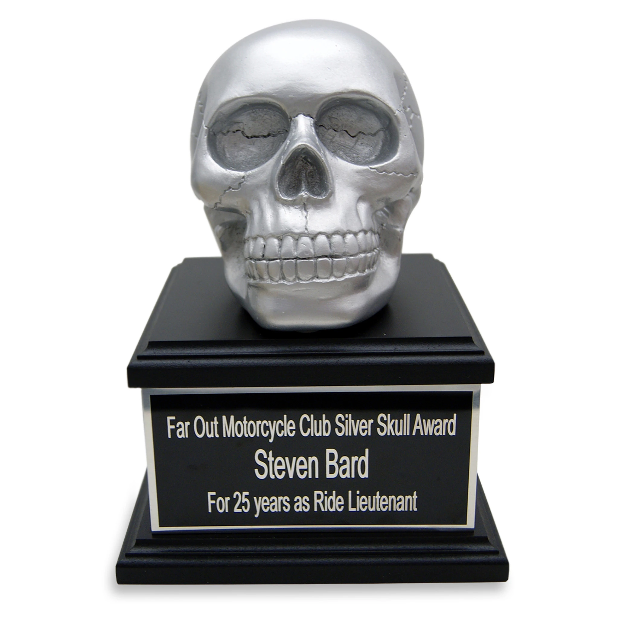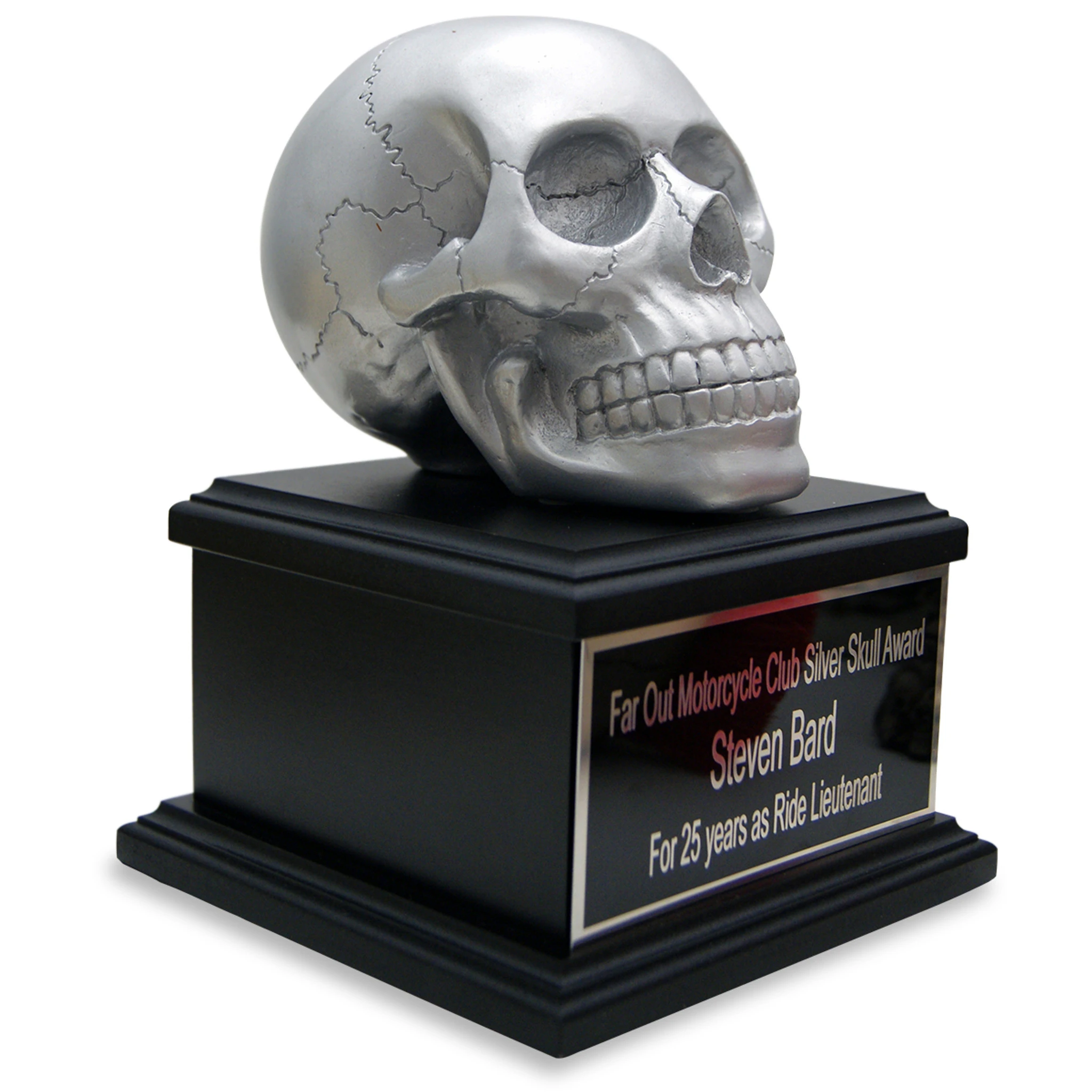 The Silver Skull Award stands 8.5″ H x 6″ W