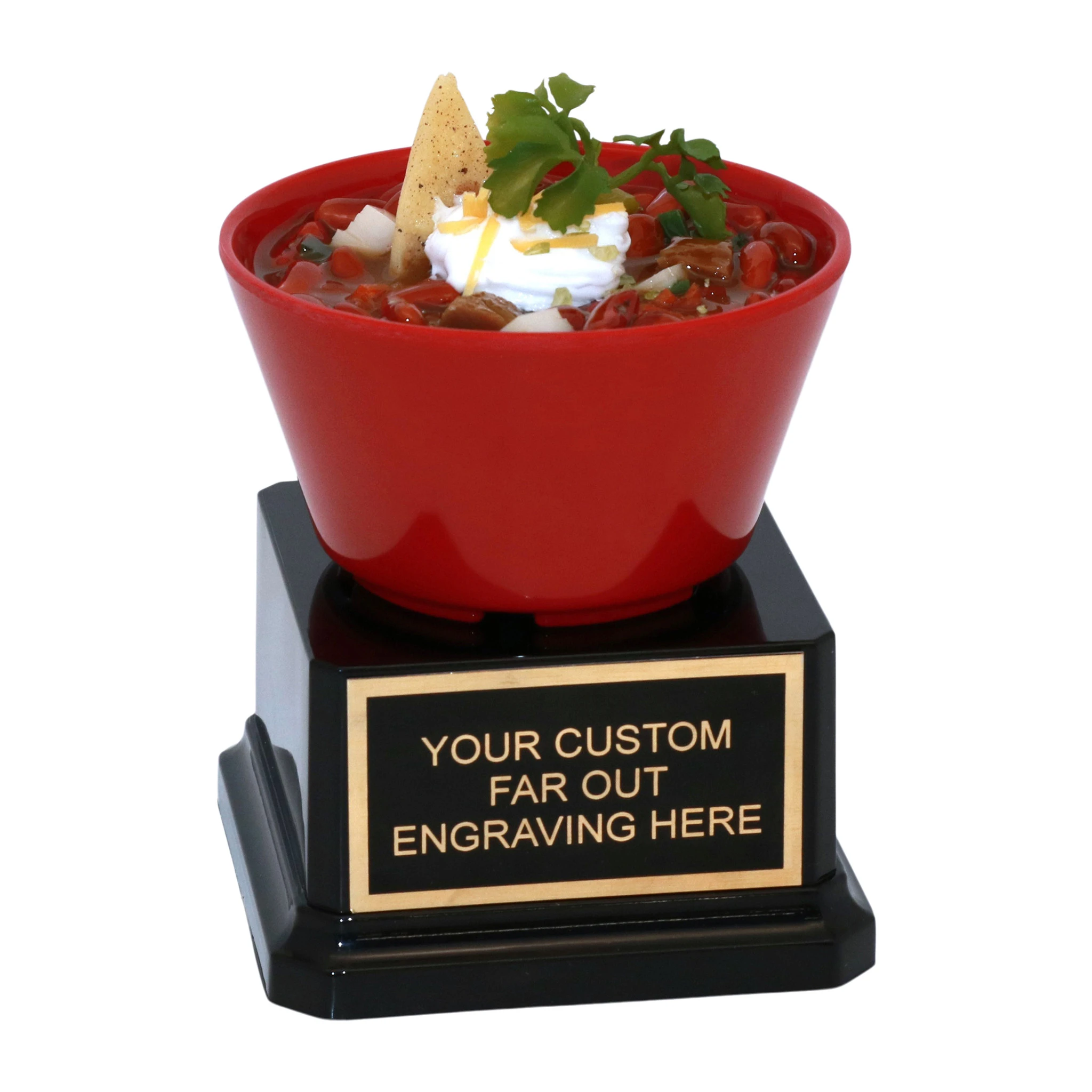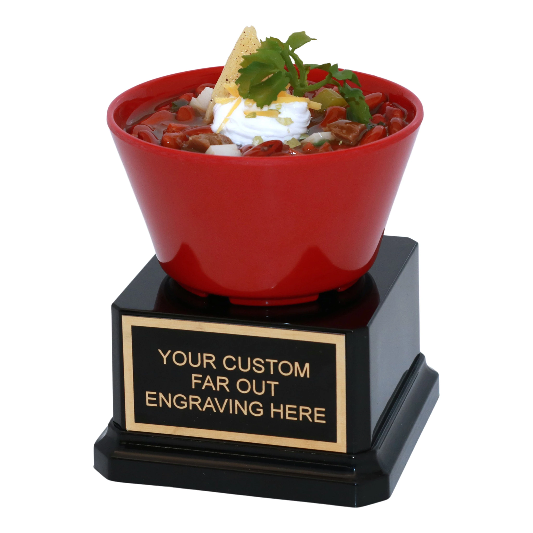 The smallest of our chili bowl lineup, the small bowl of chili trophy is a great award for any chili lover or chili cook-off contest. Check out all of our Chili Awards in our chili category right HERE. This small bowl of chili would make a great third place with our Medium Bowl of Chili Trophy for 2nd place, the Large Bowl of Chili Trophy for 1st place, and the Super Chili Trophy for grand prize!