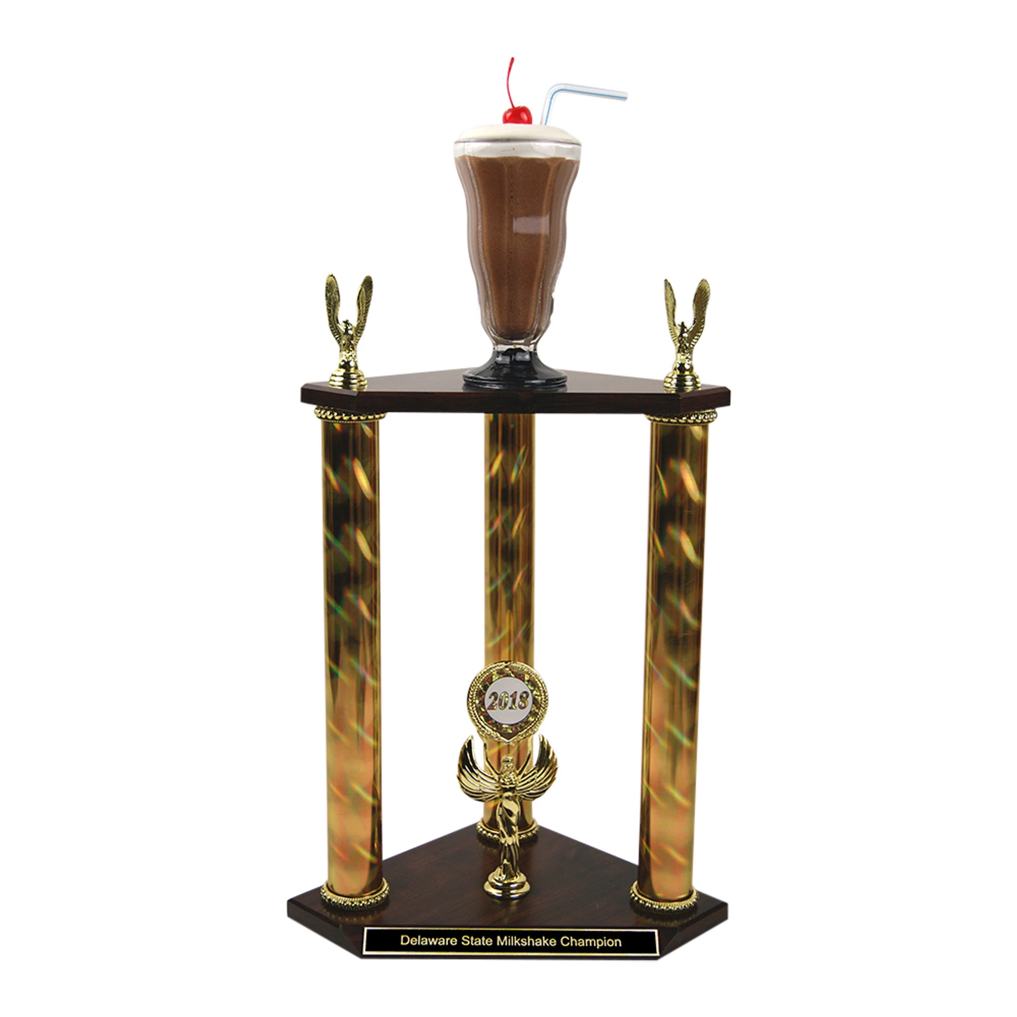 The taller version of our classic Milkshake Trophy , the super milk shake trophy is a great 1st place award for your ice cream, milk shake, and other sweet events. Pictured in chocolate, the milkshake can also be changed to a vanilla milkshake or strawberry milkshake at no extra cost – just make a note in the comments!