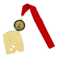 Award the big cheese with the Swiss Cheese Medal. Perfect for anyone who loves cheese. Makes a great runner up award for cheese making competitions when given with our Cheese Trophy. Cheese wedge measures 5.25″ by 4.5″. Hangs on a 1.5″ wide ribbing that is 15″ long. Many ribbon styles available. Personalize the Swiss Cheese Medal with an engraved Antique Gold Wreath Medal for an additional $10.Â