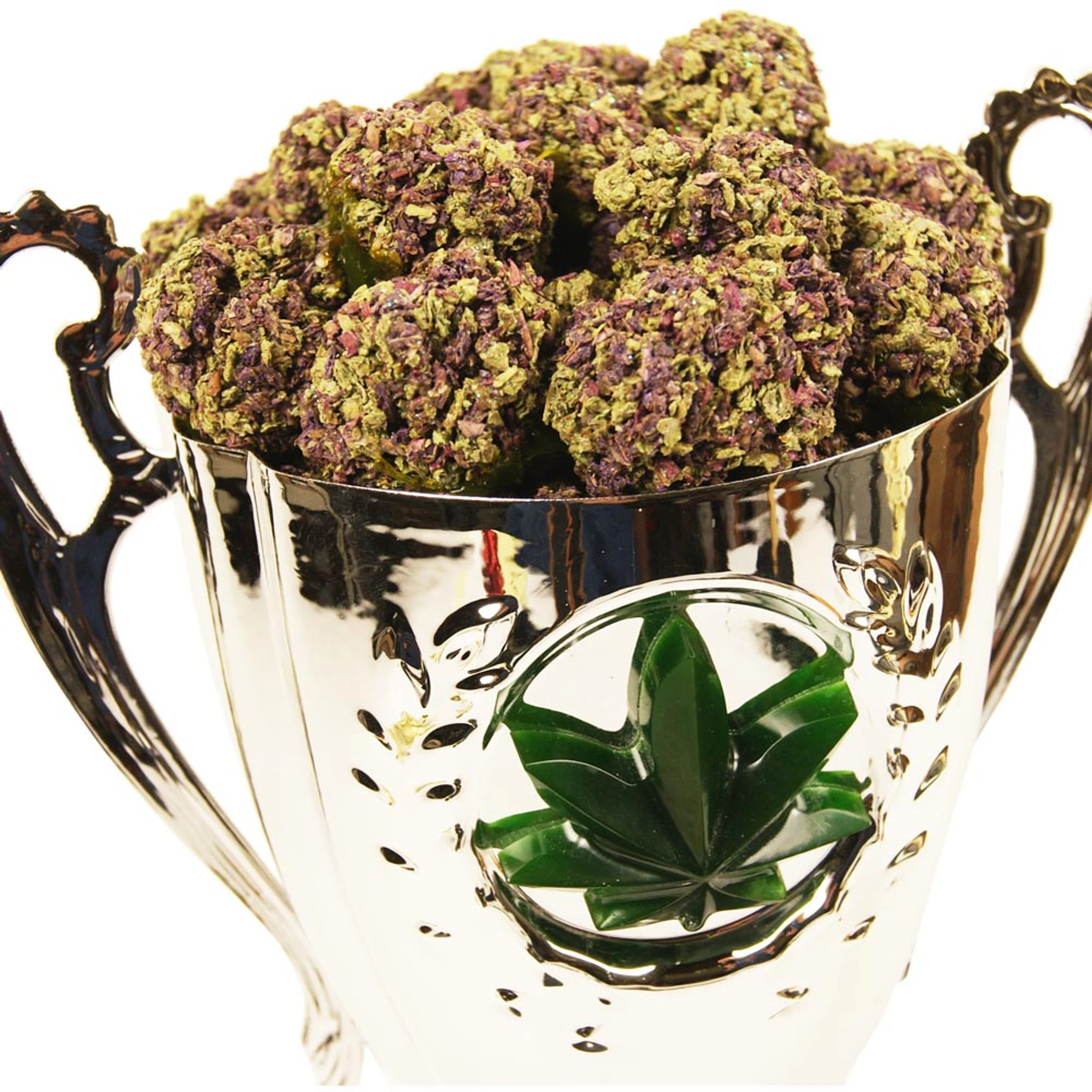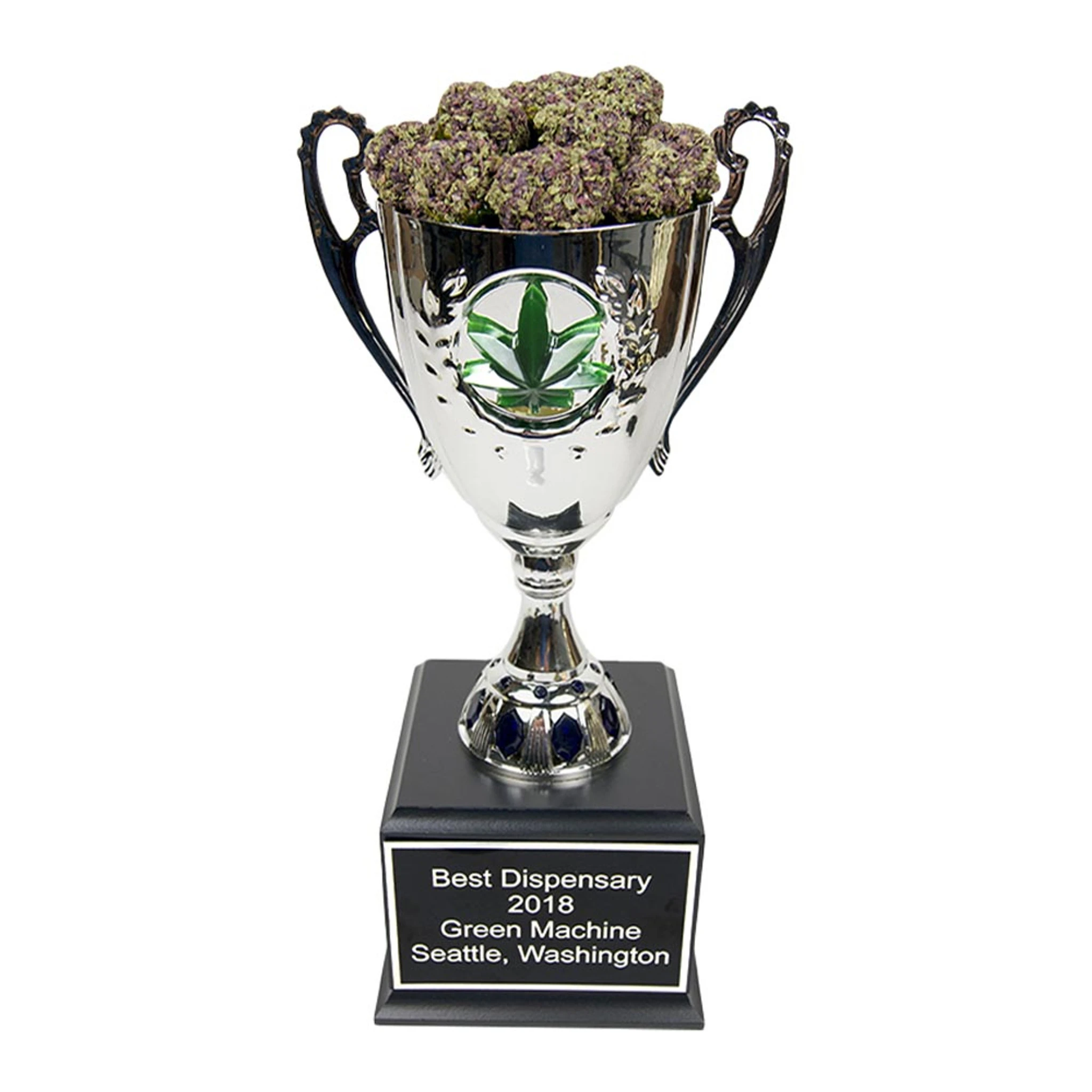 The Bud Cup Trophy comes filled with high quality detailed looking fake marijuana buds.Ā Trophy stands.Ā 14.5ā High x 5.5ā Square. A unique deluxe cannabis award for theĀ marijuana and weed connoisseur.