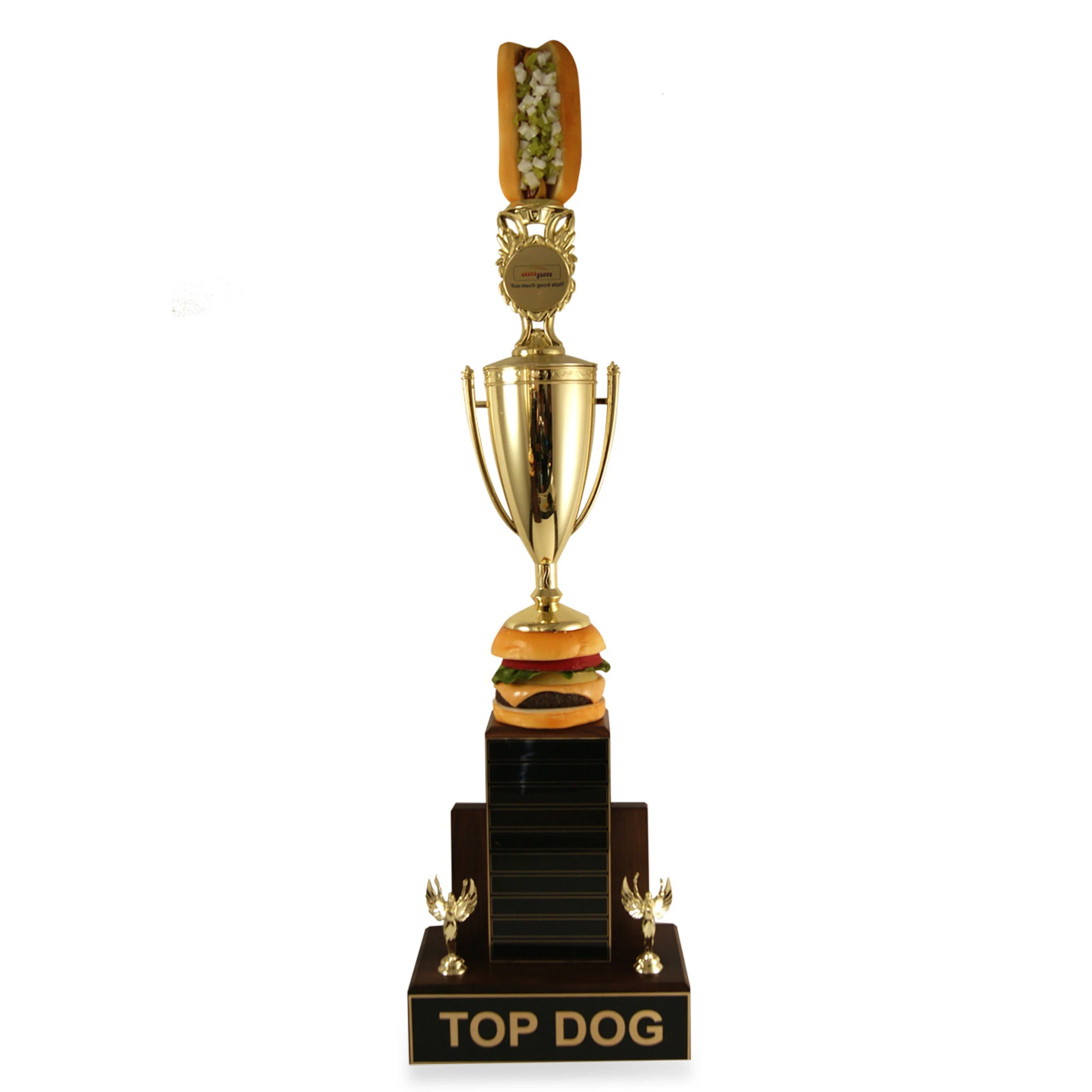 The top dog burger trophy is ~ 32” tall x 9” wide