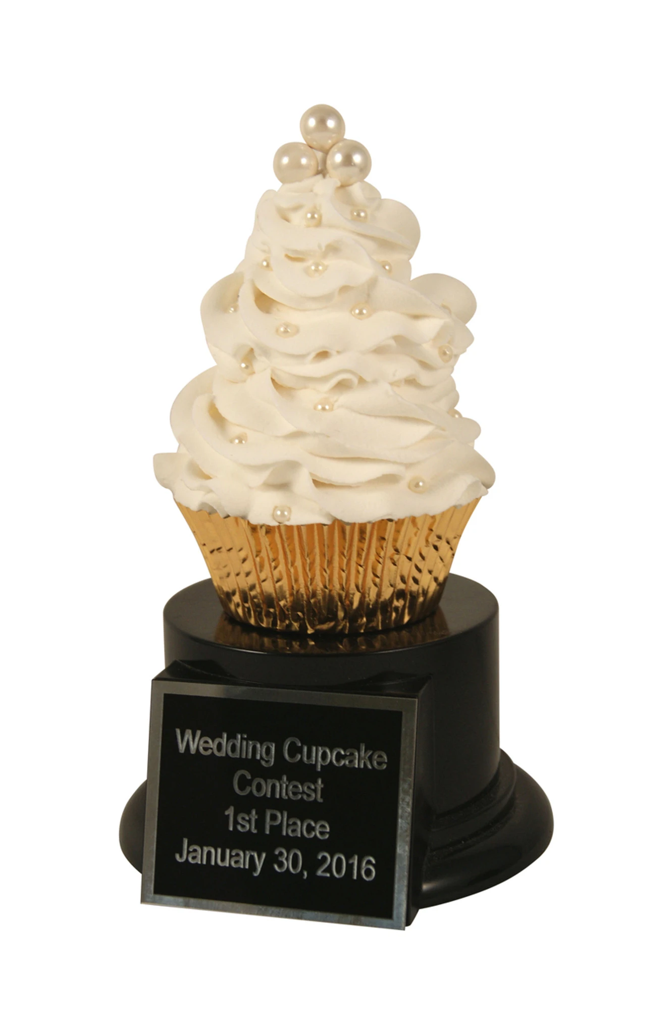 The elegant Wedding Cupcake Trophy is a great gift for your sweet little cupcake. A great bridal shower gift, anniversary gift, or even a thank you to your cake-decorator, this beautiful wedding cupcake adorned with pearls is sure to make a lasting impression. Check out all of our dessert awards for other sweet inspiration.